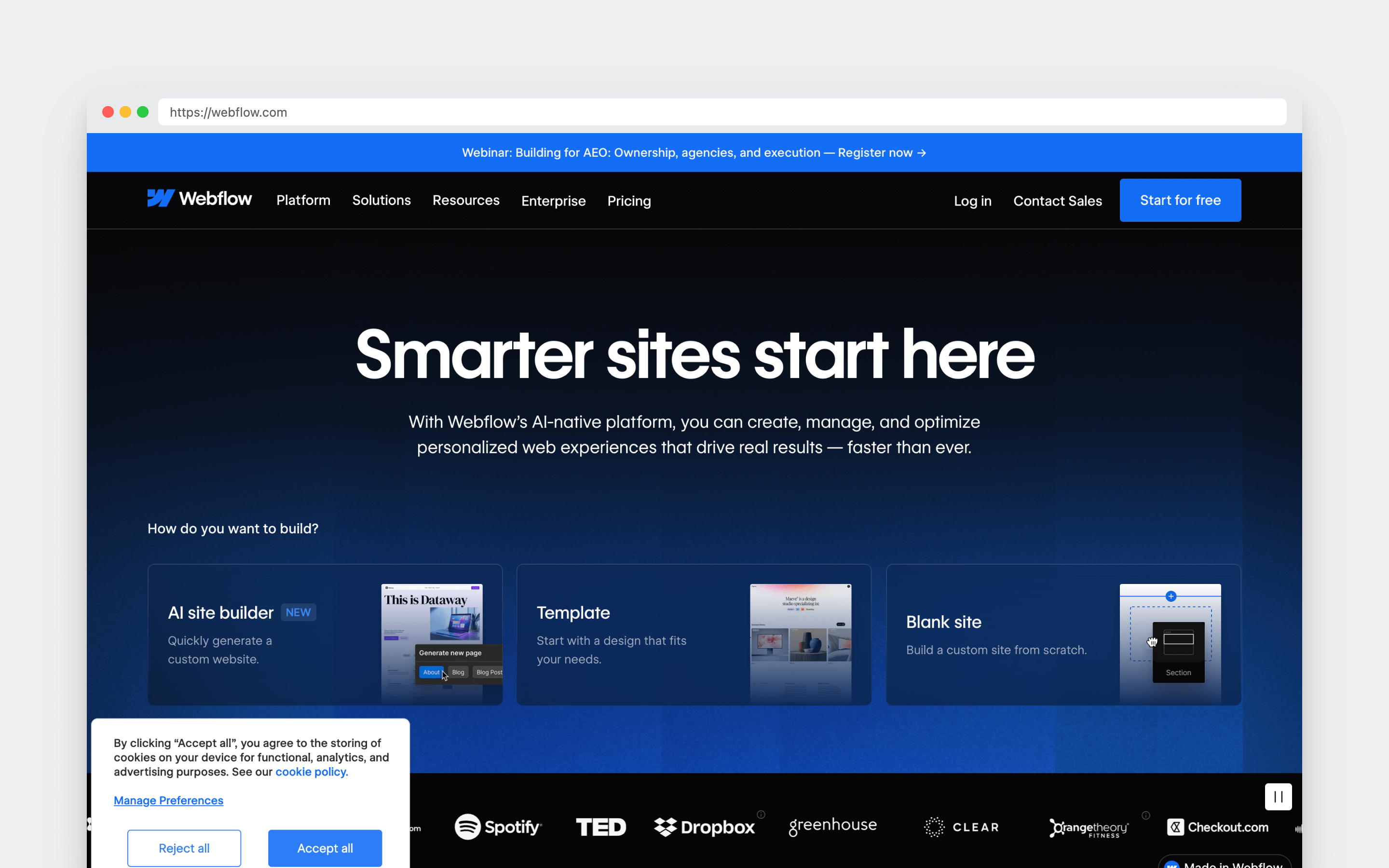 Webflow includes AI-powered auditing that helps identify missing metadata, improve clarity, and strengthen technical fundamentals that affect both traditional search and AI-driven discovery.