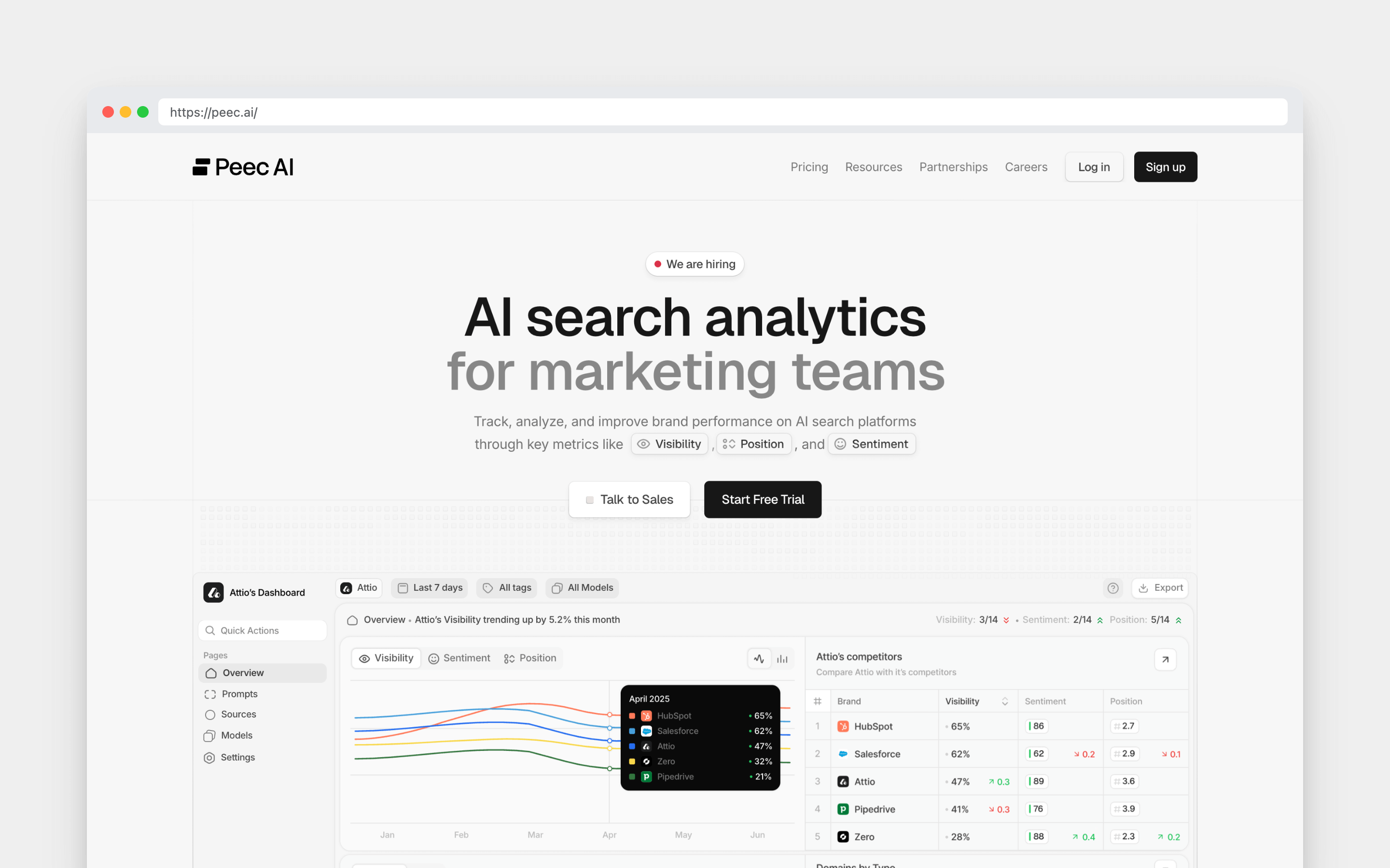 Peec AI focuses on monitoring brand visibility in AI-generated answers, with prompt-level tracking and competitor comparisons.