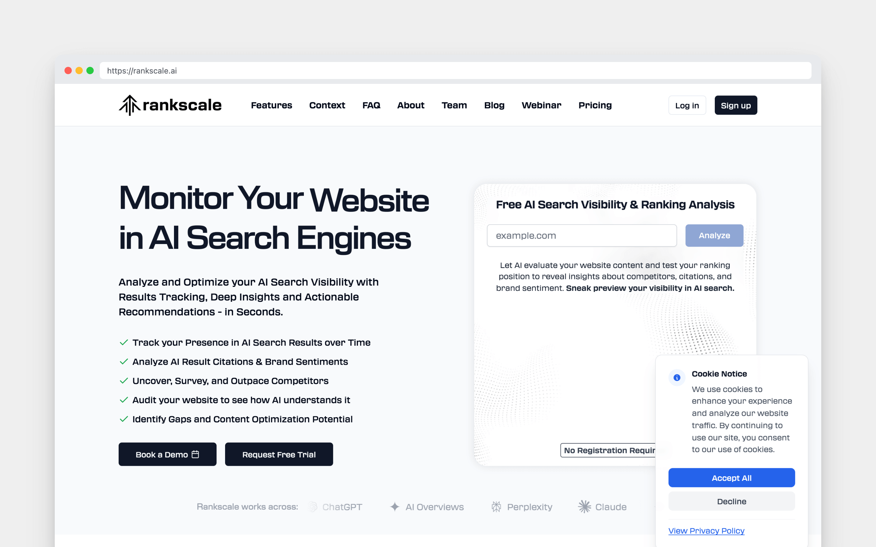 Rankscale AI tracks AI citations and brand presence across answer engines, often with sentiment monitoring.